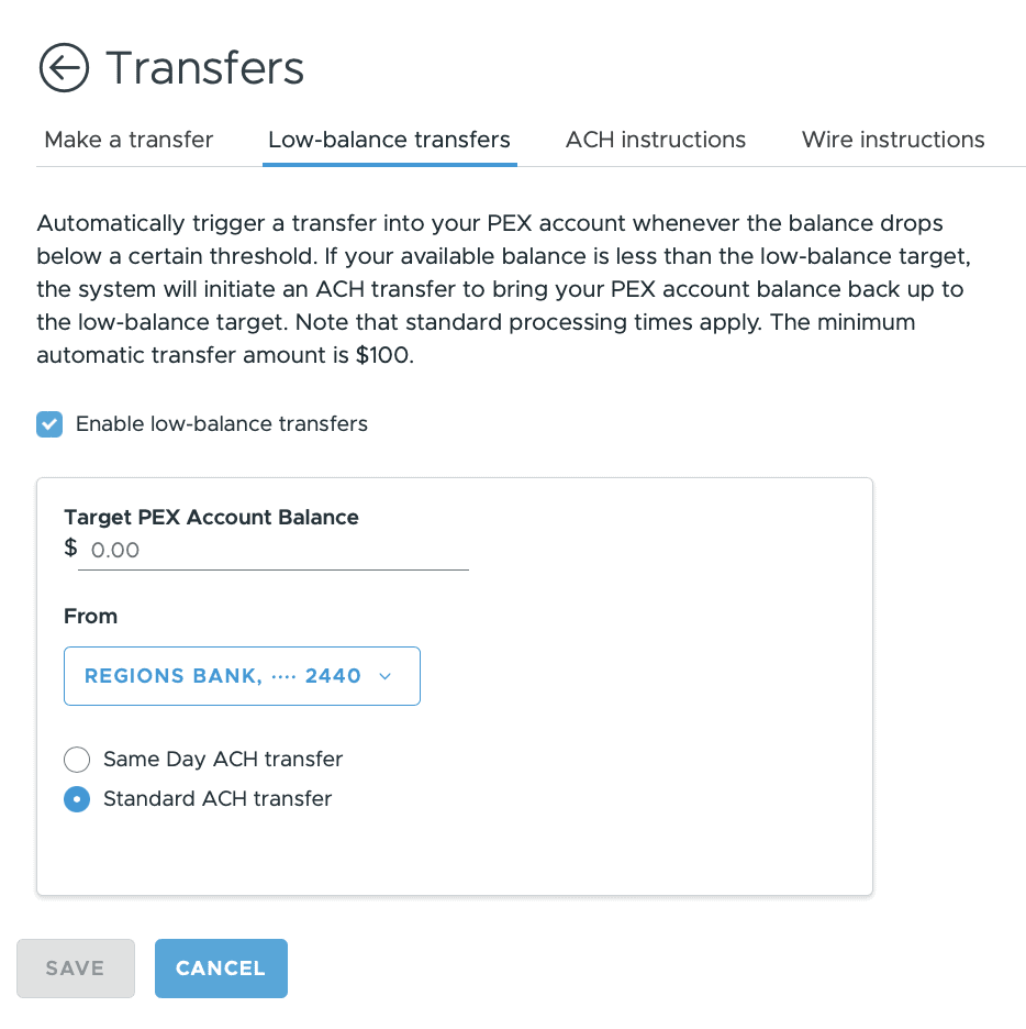 Running out of funds while on the road can be a major inconvenience. To ensure your PEX account is always ready, we’ve introduced the Low Balance Transfer feature. Admins can set a funding rule to schedule ACH transfers automatically when the account balance drops below a set threshold. This guarantees that funds are available whenever they’re needed, without the worry of manual intervention.