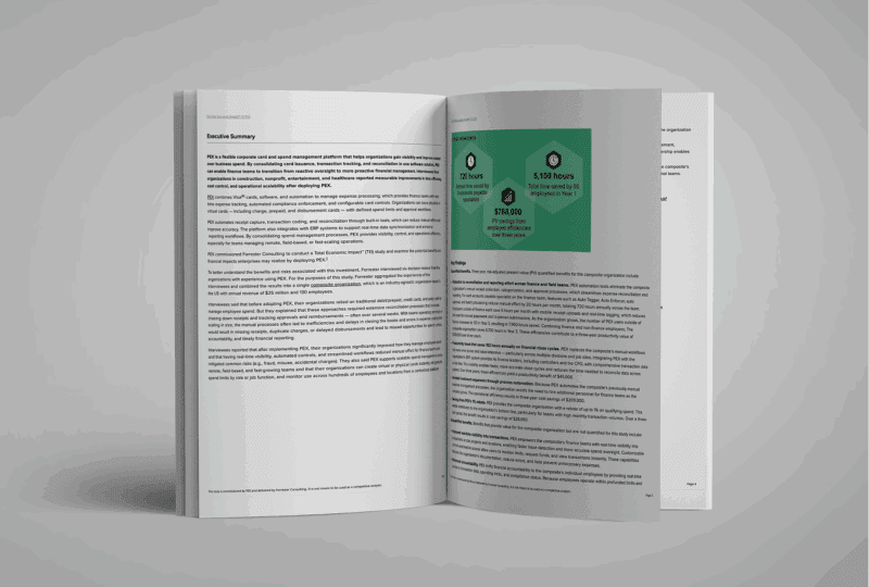 Download the Forrester study, commissioned by PEX, to see how PEX delivered more than $1.1M in value across three years. The study also show how PEX improves visibility, simplifies workflows, and makes it easy for both finance and non-finance teams to adopt.